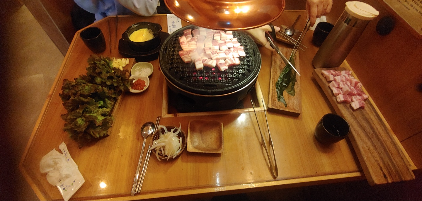 게다가 맛도 좋은데 가격도 괜찮으니 맛있게 많이 먹어도 부담이 덜하고, 삼겹살도 굽고나서 가위로 일일이 자를 필요도 없어 좋고, 기름이 고이지 않아 기름이 사방팔방 튀는 일도 없다. 게다가 화로구이 불판으로 구워지는 삼겹살은 기름이 밑으로 쭉 빠져나가서 그런가 고기가 쫀득쫀득한 게 씹히는 맛이 정말 일품이다.