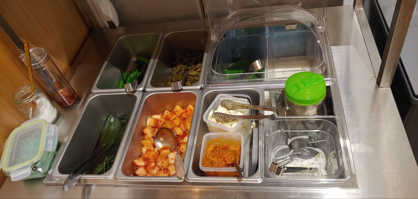 멍하게 있기 보다는 이렇게 셀프바에 가서 필요한 야채와 반찬들을 가져오는 게 좋다.